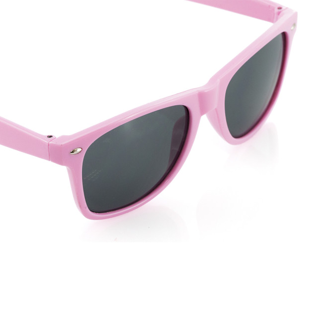Occhiali da sole con protezione UV400. Montatura robusta dal design elegante e dalla finitura lucida, in colori divertenti e variegati. Le lenti sono nere per garantire lo stile. Presentati in un sacchetto individuale riciclato.