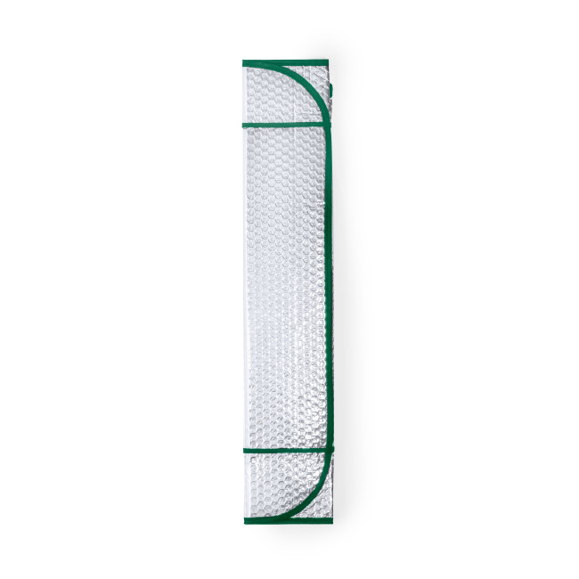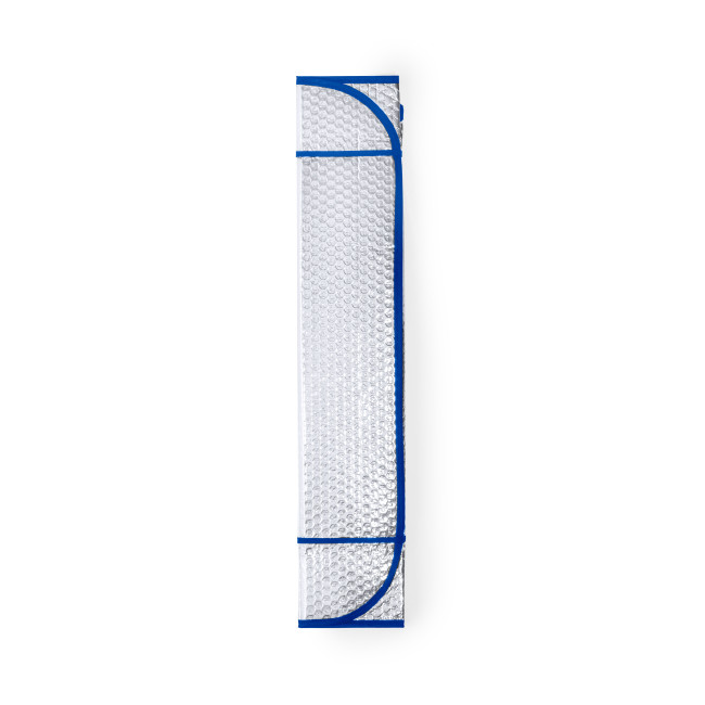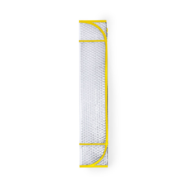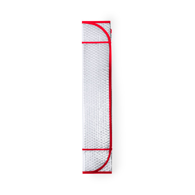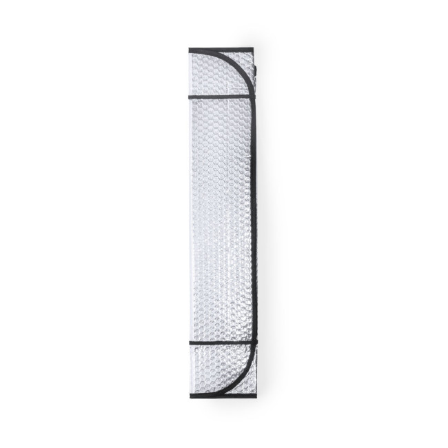 Parasole in alluminio con bolle su entrambi i lati. Finitura argento metallizzato, con bordi neri e dimensioni 130 x 70 cm. Con elastici per la piegatura e inviato steso per facilitare la stampa.