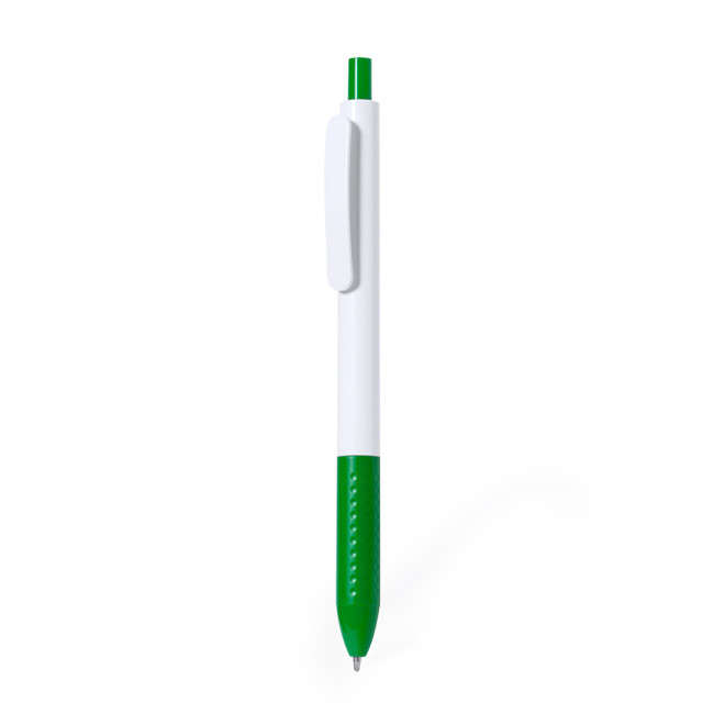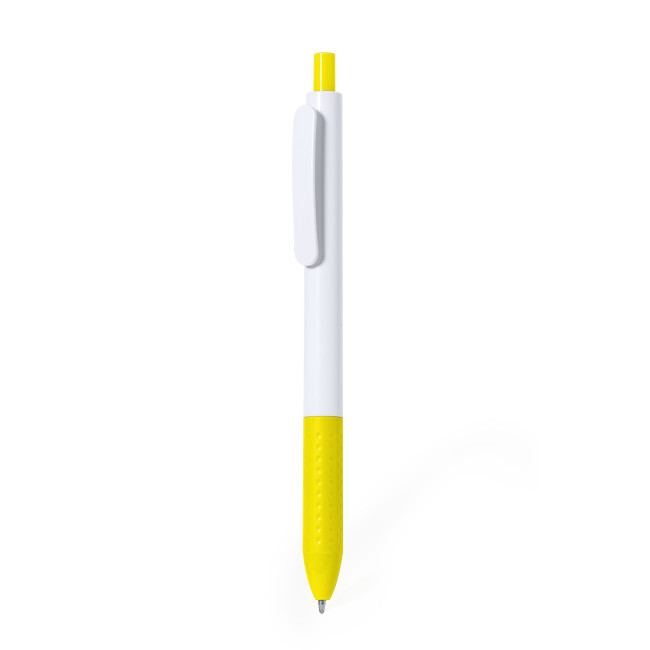Penna con meccanismo a pulsante in robusto ABS. Realizzata in un'elegante combinazione di fusto e clip di colore bianco. Con pulsante e impugnatura disponibili in una vivace varietà di colori. Inchiostro blu.