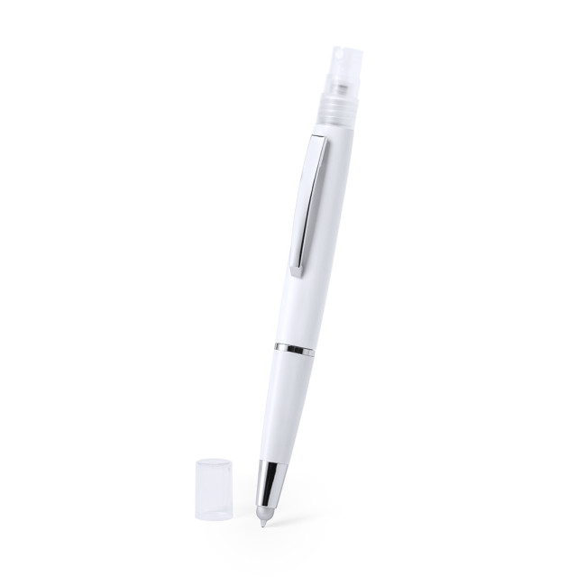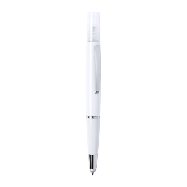Penna antibatterica con spray ricaricabile integrato e cappuccio protettivo, include puntatore grigio. Finitura liscia in resistente ABS lucido con elegante clip in metallo e scritta in inchiostro blu. Capacità spray 3ml. Liquido non incluso.I prodotti con trattamenti antibatterici sono in grado di ridurre drasticamente le cariche batteriche presenti sulle superfici dei materiali, grazie all'incorporazione di agenti microbici permanenti statici, altamente efficaci nell'inibire e prevenire la contaminazione batterica.Articolo secondo la norma ISO 22196, che determina l'attività antibatterica in materiali plastici e superfici non porose, che permette di conoscere l'efficacia dell'inibizione microbica che gli additivi hanno sugli oggetti trattati attraverso una valutazione quantitativa