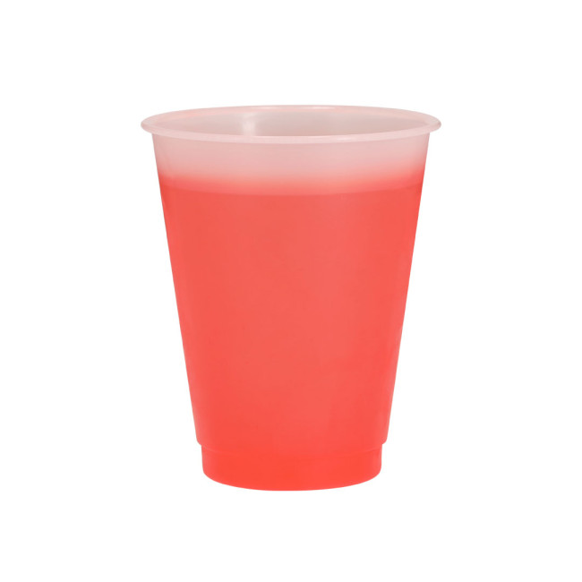 Bicchiere che cambia colore a contatto con bevande fredde. Capacità di 500 ml. Con finitura opaca traslucida e realizzato in materiale PP resistente.