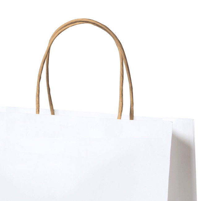 Borsa della linea natura, realizzata in carta riciclata da 100g/m2 in finitura bianca, con manici corti rinforzati in colore naturale e soffietto. Resistenza fino a 6 kg di peso.