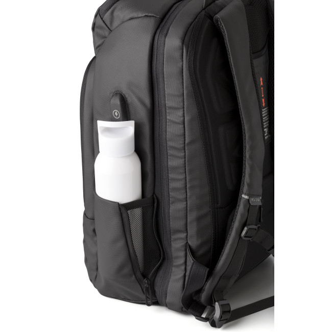 Zaino incluso scomparto per laptop imbottito 15 pollici, tasca laterale isolata in alluminio, schienale imbottito, spallacci imbottiti e regolabili, speciale funzione per la riduzione del peso, porta e cavo USB, cinturino, maniglia in metallo, in PU 600 D