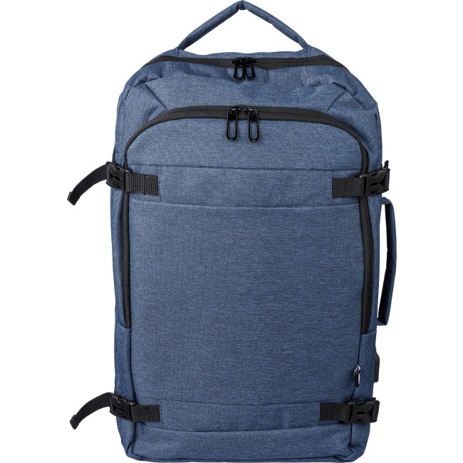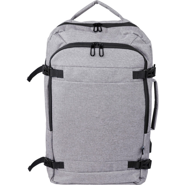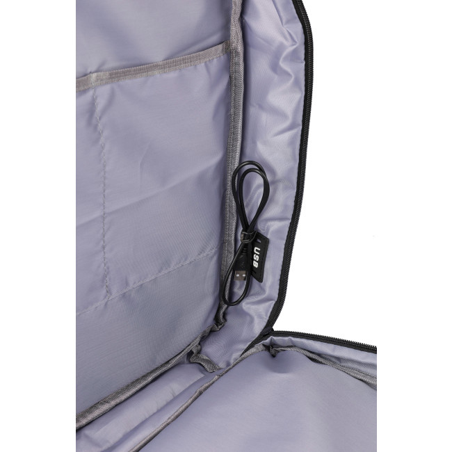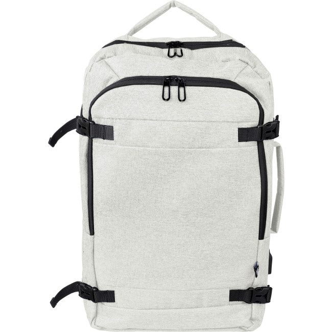 Zaino in poliestere rPET 300 D con fodera interna 210 D, adatto per computer portatile da 17 pollici, a prova di cabina, passante per il trasporto sulla parte superiore e sui lati, scomparto per laptop con velcro, tasca antifurto, due grandi scomparti con chiusura lampo, schienale imbottito ventilato, passante per trolley, fibbie di chiusura, porta USB-A sul lato, fibbie laterali per tenere compatto il bagaglio, peso massimo trasportabile circa 12 kg, include etichetta rPET