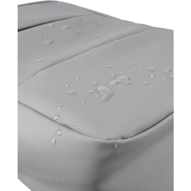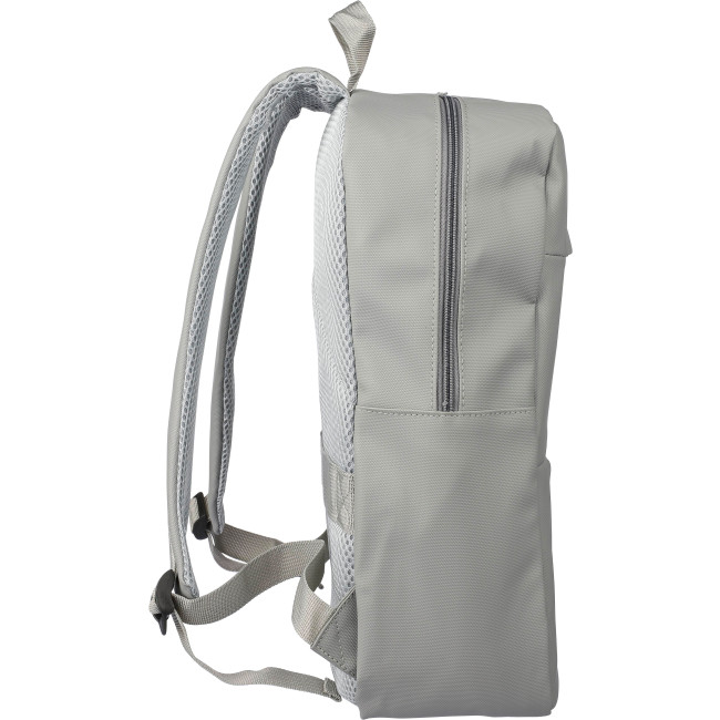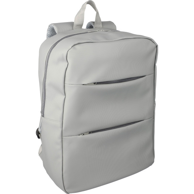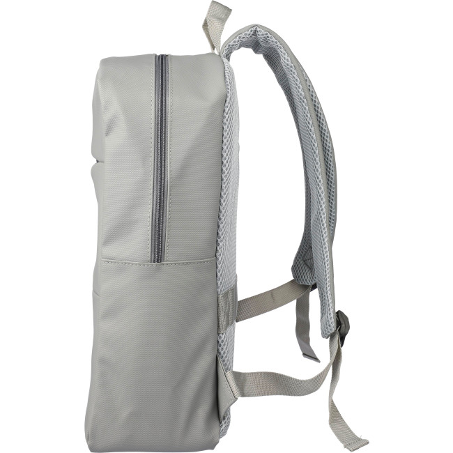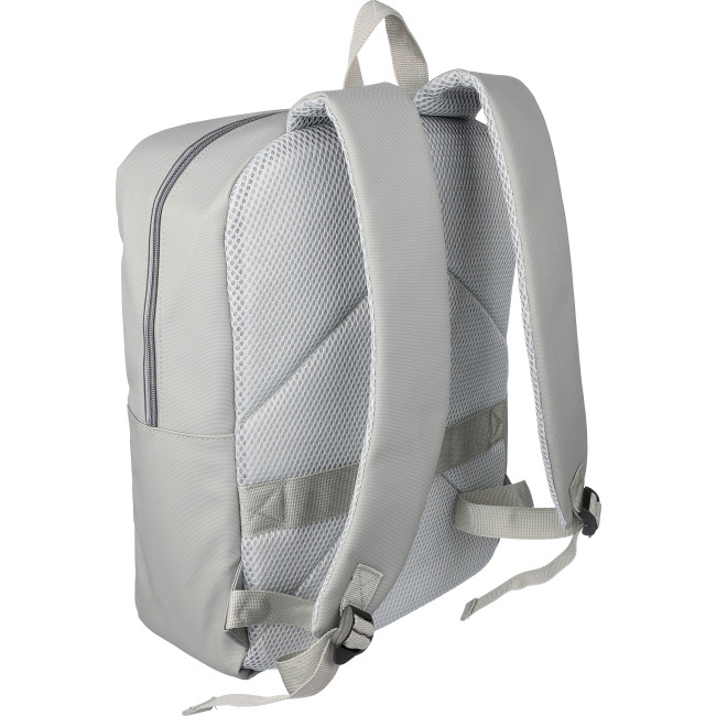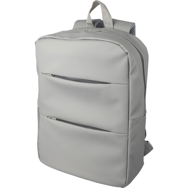 Zaino portacomputer in PU da 15 pollici, include due tasche anteriori con chiusura lampo, ampio scomparto con chiusura lampo, vano per il laptop con chiusara a velcro, molteplici inserti interni, schienale ventilato ed imbottito, cintura per trolley, spallacci regolabili, idrorepellente