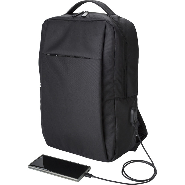 Zaino portacomputer in rPET 300 D, dettagli 210 D, adatto per un laptop da 16 pollici con chiusura in velcro, interno con tasche multiple, scomparto frontale con chiusura lampo, sul lato porta USB con cavo all'interno