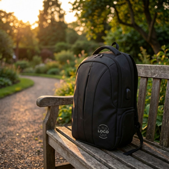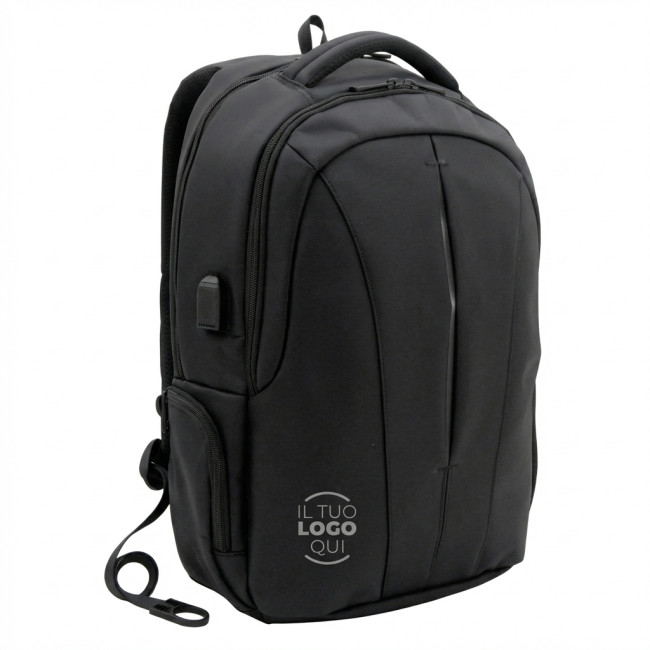 Zaino portacomputer dotato di spallacci imbottiti e regolabili, con tasche laterali e sul retro. Include un vano portacomputer imbottito e una chiusura antifurto per una maggiore sicurezza. Materiale: nylon/polyestere. Dimensioni: 30x46,5x11 cm. Personalizzabile con logo.
