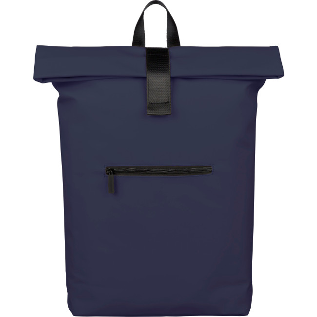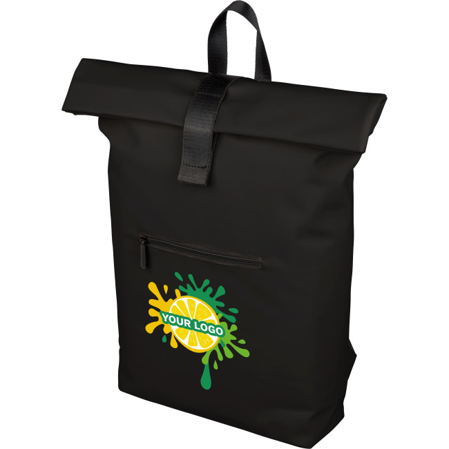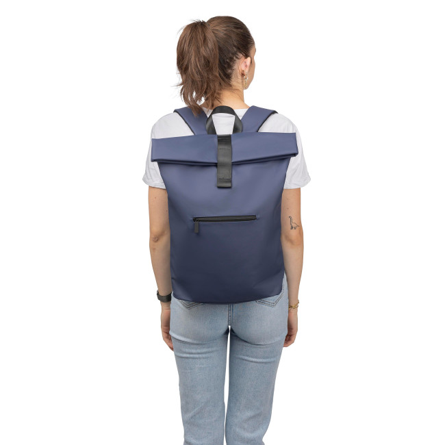 Zaino rolltop in PU riciclato, capacità di 19?litri, chiusura rolltop con cinturino in velcro, tasca frontale con chiusura lampo, scomparto interno per laptop fino a 16 pollici, fodera in poliestere 210 D riciclato, spallacci regolabili e ventilati, maniglia superiore e etichetta materiale "riciclato" interna.
