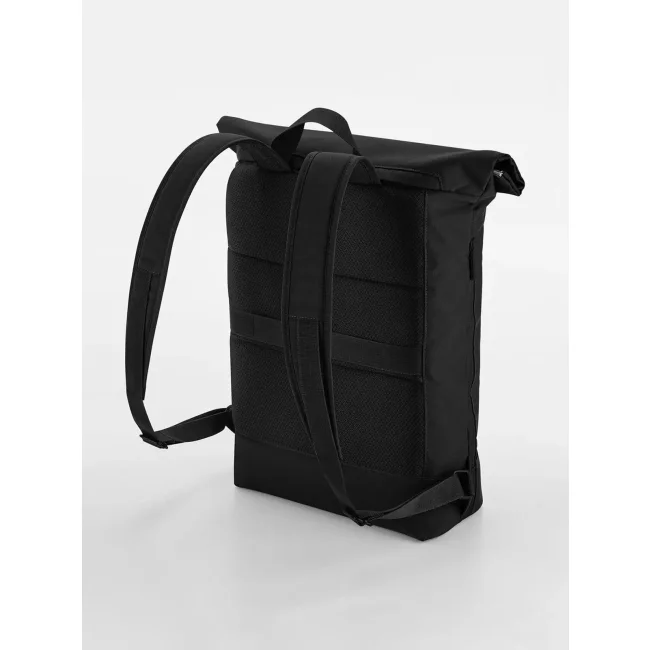 Zaino Roll-Top Simplicity realizzato in 100% poliestere riciclato, progettato per laptop fino a 15.6''. Presenta un tessuto idrorepellente e una chiusura magnetica roll-top. Include tasche esterne, una tasca laterale con zip per bottiglia o ombrello, e schienale in rete imbottito. Dimensioni: 50x40x13 cm, capacità di 15 litri, area stampabile di 27x34 cm.