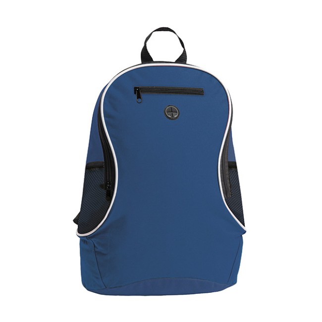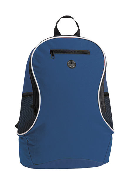 Zaino in nylon 600D con tasche laterali in materiale traforato, tasca esterna con zip, taschino interno per auricolari, foro esterno passacavi e spallacci imbottiti regolabili.