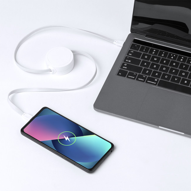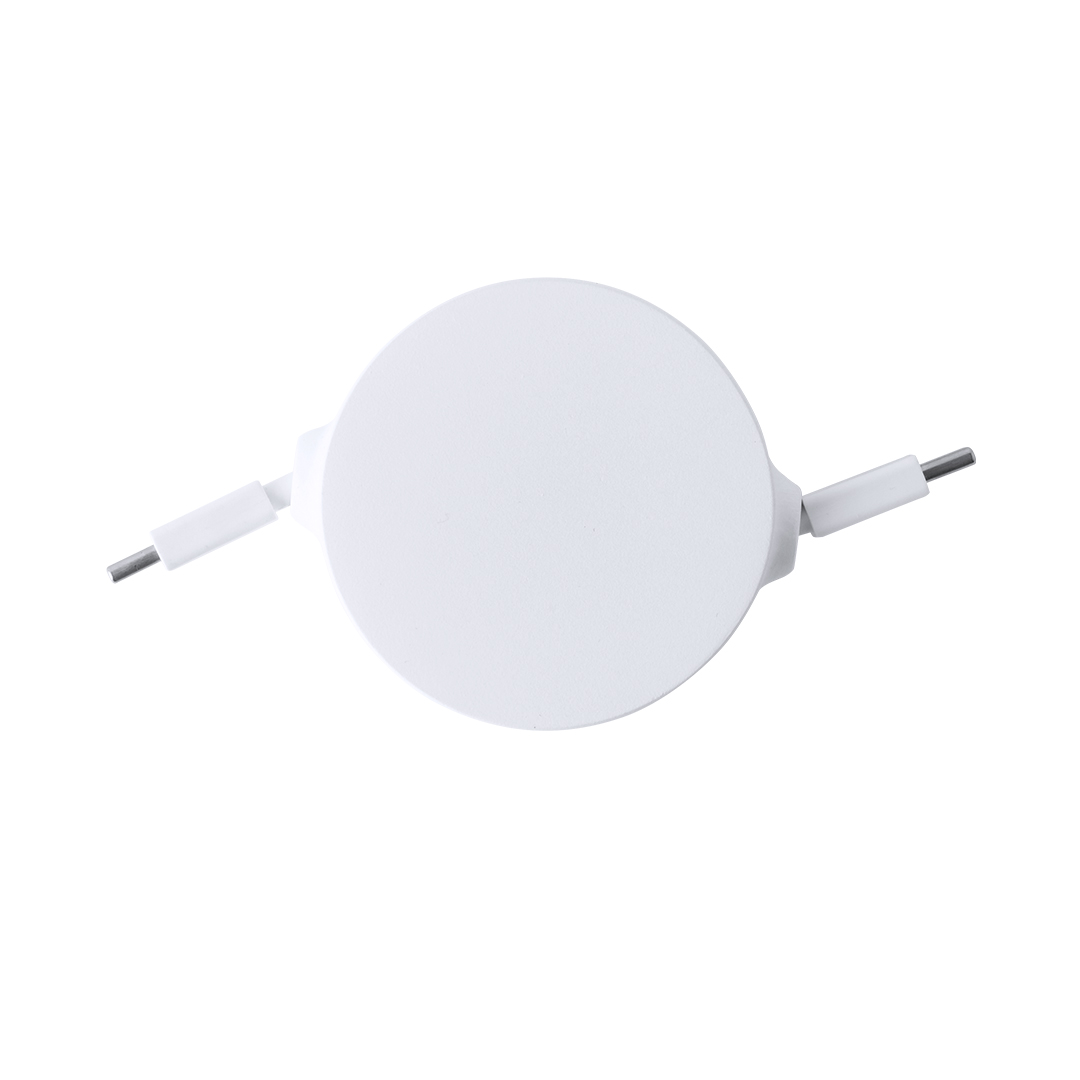 Cavo di ricarica e sincronizzazione estensibile, adatto alla ricarica di dispositivi e al trasferimento di dati. Realizzato in robusto RABS bianco. Parte centrale con ampia area di stampa e meccanismo interno estensibile. Include connessioni di ingresso e uscita di tipo C. Confezionato singolarmente in un sacchetto kraft.Il RABS è una plastica altamente riciclabile e resistente, con una moltitudine di applicazioni che la rendono una soluzione ecologica. Con certificazione RCS, che ne garantisce l'origine riciclata.