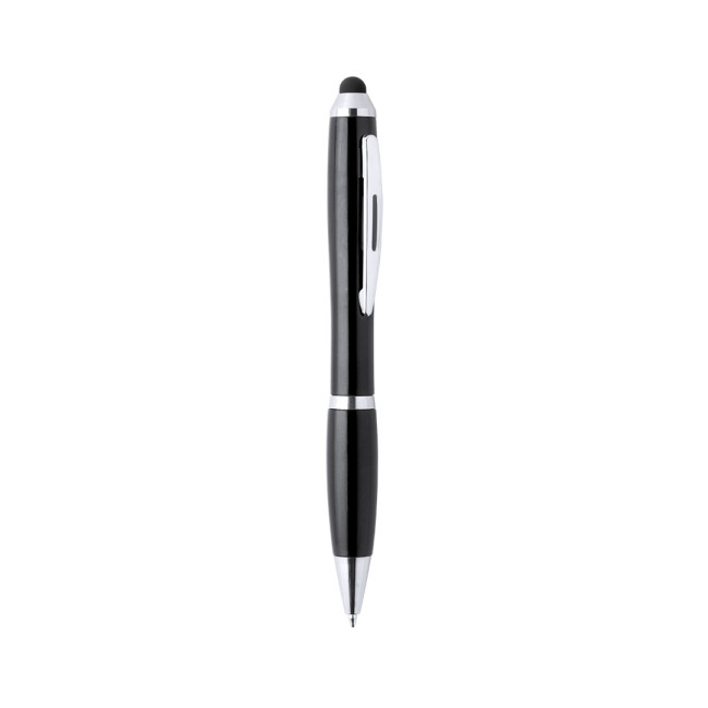 Penna touch colorata con meccanismo a rotazione con fusto dai colori vivaci e impugnatura coordinata. Con elementi cromati e clip in metallo. Cartuccia Jumbo e inchiostro blu.
