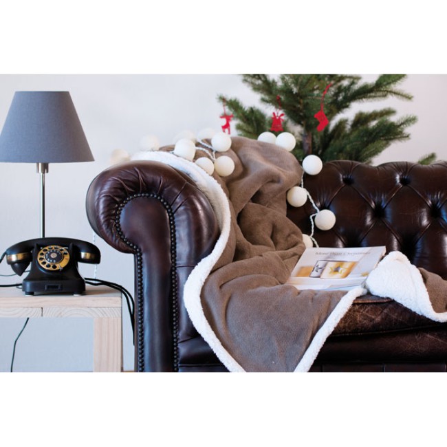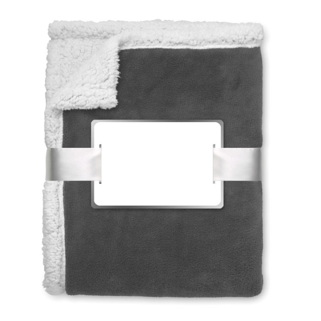 Coperta in pile 200gr con strato reversibile in sherpa 220gr. Confezionata con nastro e cartoncino stampabile.