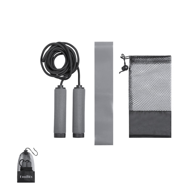 Set sportivo che include: 1 elastico da 25x5 cm in materiale TPE resistente e di media resistenza 1 corda da 260 cm con maniglie HIPS rivestite in EVA. Confezionato in fodera in poliestere con chiusura a cordoncino e accessorio di regolazione.