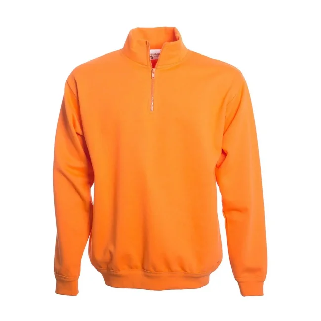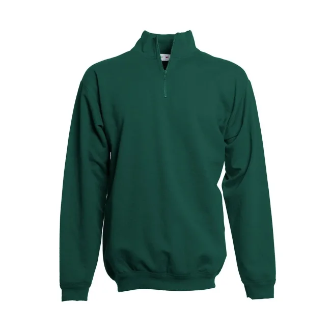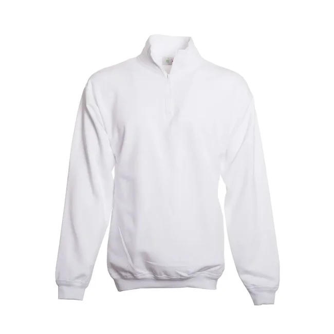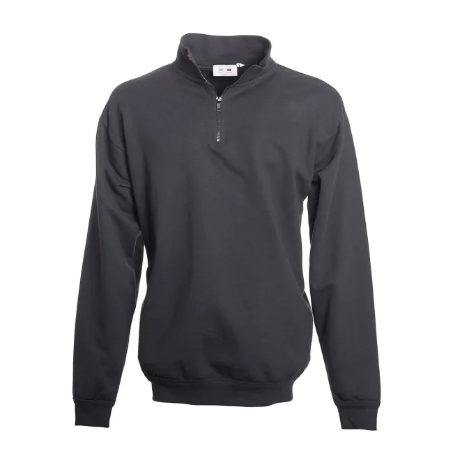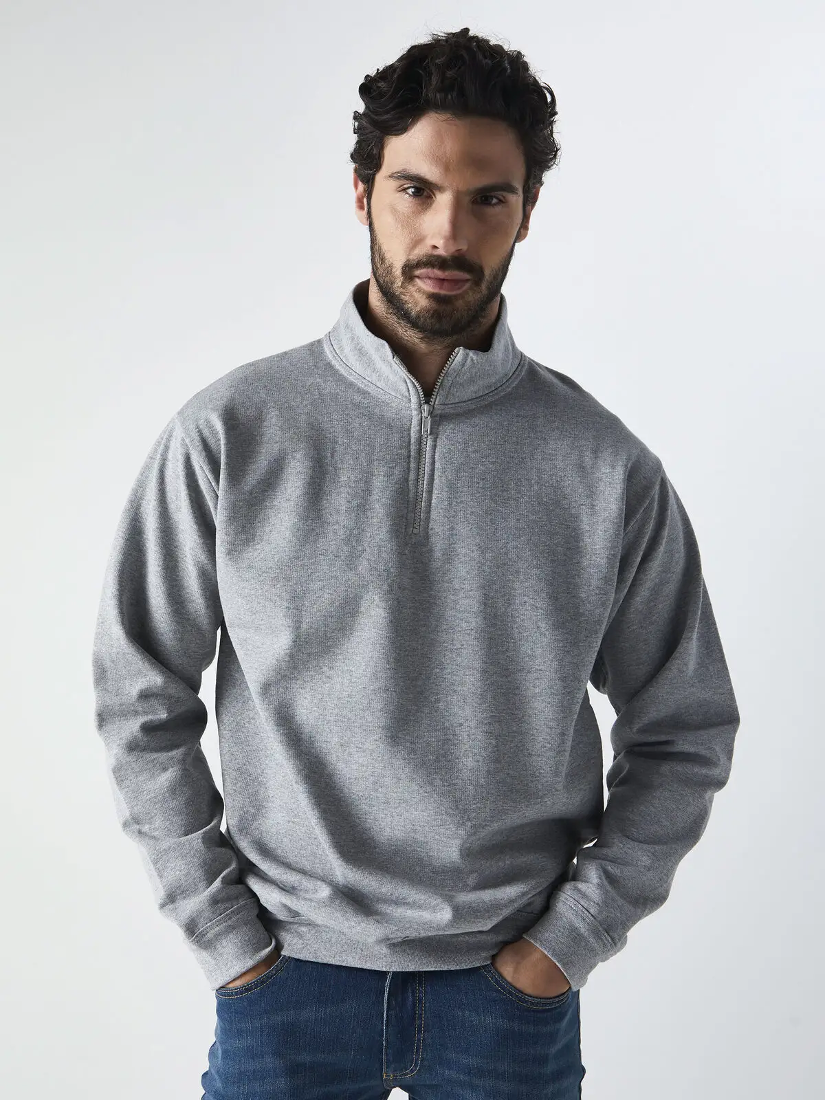 80% cotone, 20% poliestere. Felpa con mezza zip, manica dritta, felpata internamente. Produzione interamente italiana. Cerniera in plastica, tirazip in metallo. Struttura con cuciture laterali.