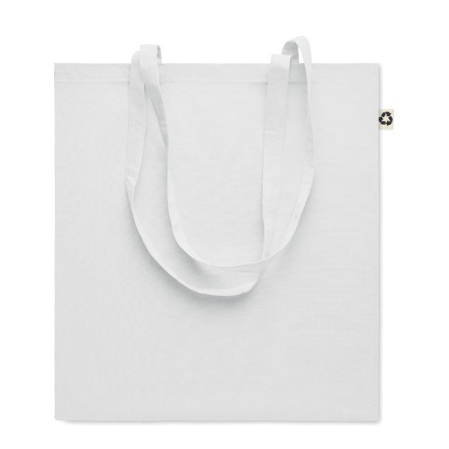 Borsa per la spesa in cotone riciclato (65% cotone riciclato, 35% cotone normale) con manici lunghi. 140 gr/m². Portate con voi questa shopper per la spesa quotidiana o usatela durante gli eventi. I lunghi manici rendono conformtevole indossarla a tracolla.