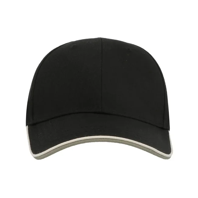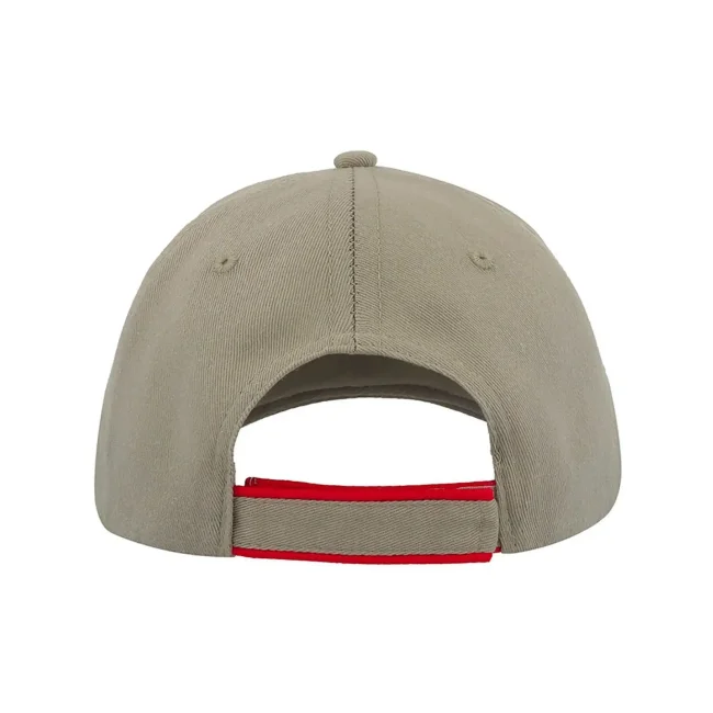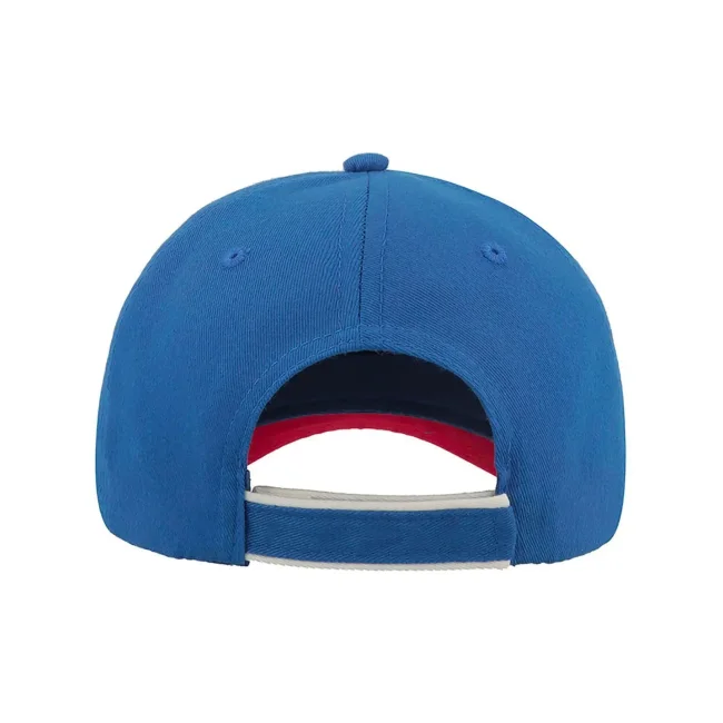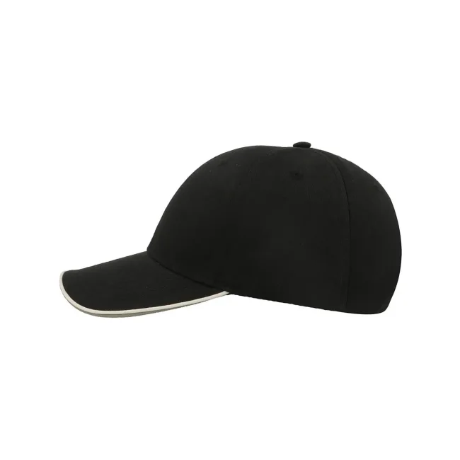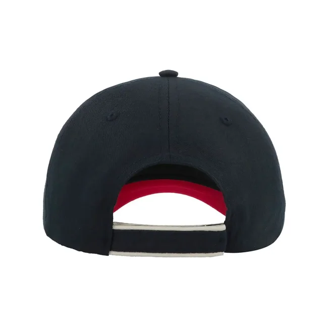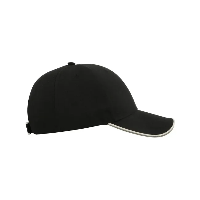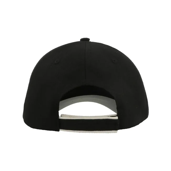 35% cotone 65% poliestere. Cappellino a 6 pannelli con visiera piping a contrasto in rilievo, sottovisiera a contrasto, chiusura con cinturino in tessuto e velcro, etichetta removibile, taglia unica.