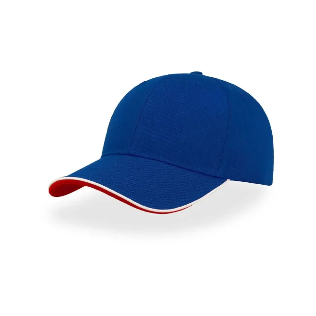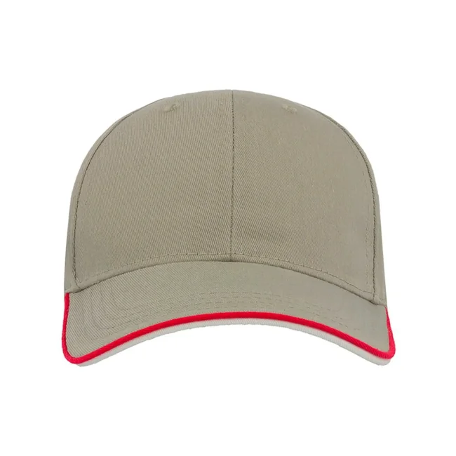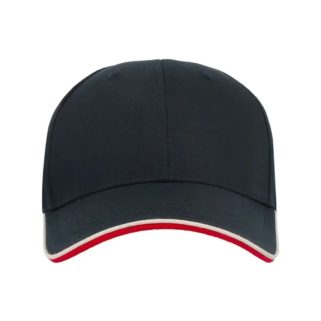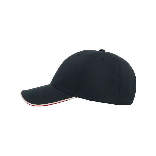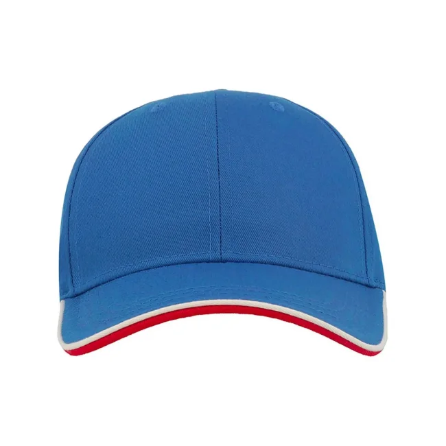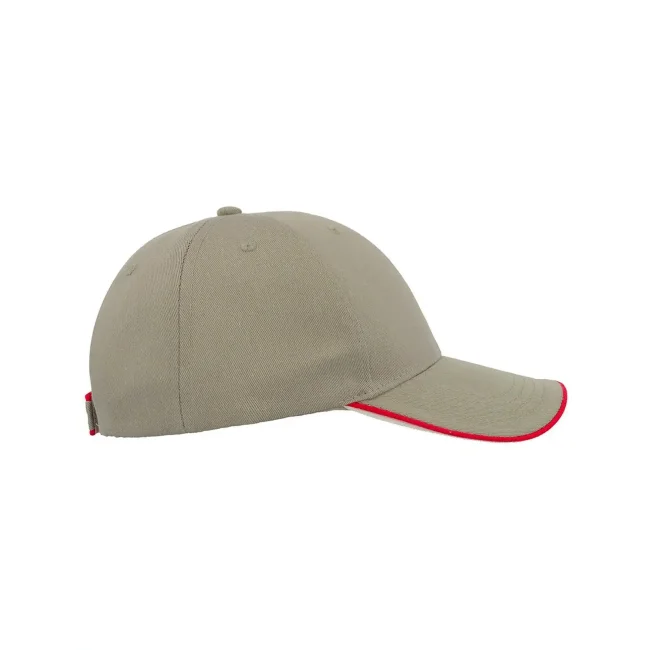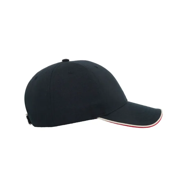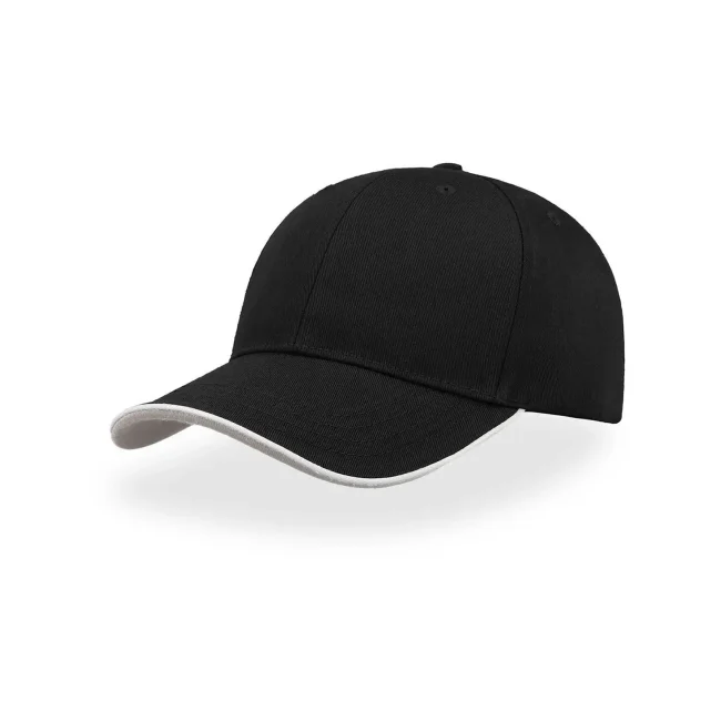 35% cotone 65% poliestere. Cappellino a 6 pannelli con visiera piping a contrasto in rilievo, sottovisiera a contrasto, chiusura con cinturino in tessuto e velcro, etichetta removibile, taglia unica.